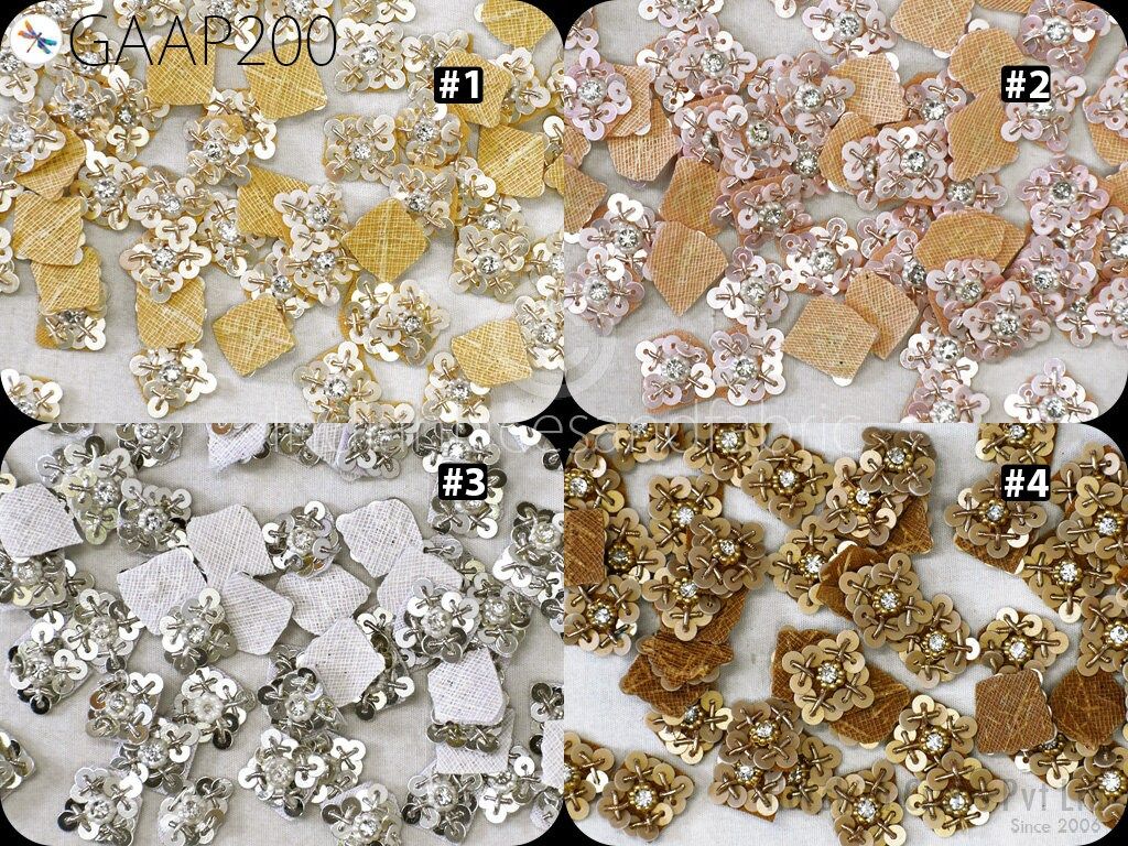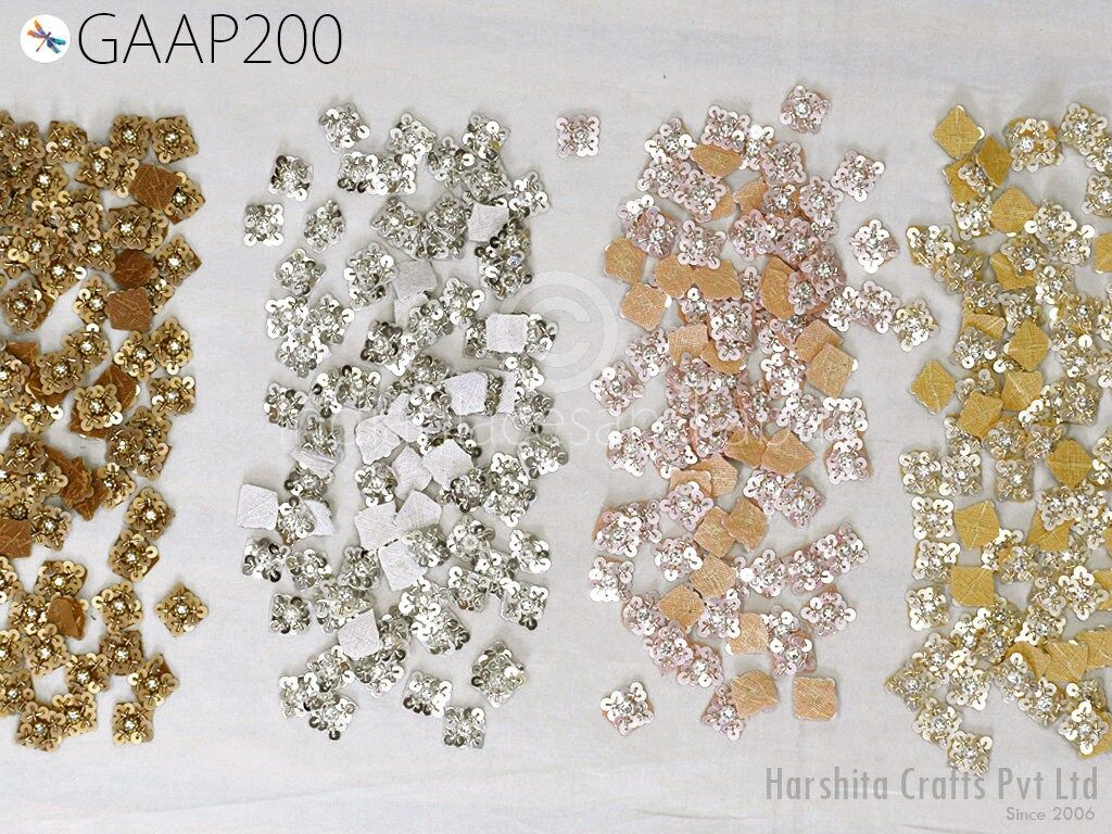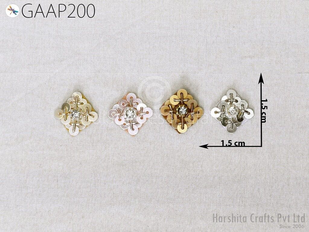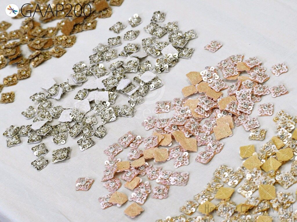 Ideal for bridalwear, costumes, accessories, and DIY crafts — each 1.5 cm patch is meticulously adorned with metallic zardozi thread and sparkling rhinestones. Sold in packs of 100 in your choice of gold, silver, antique gold, or pink-gold finishes.