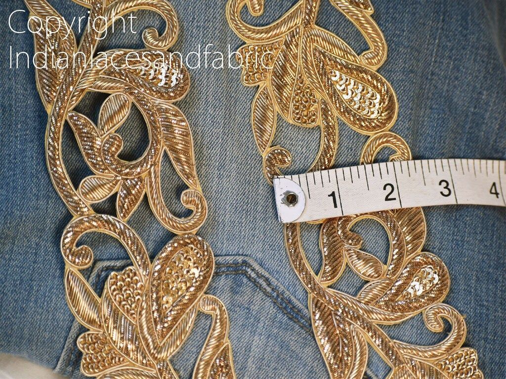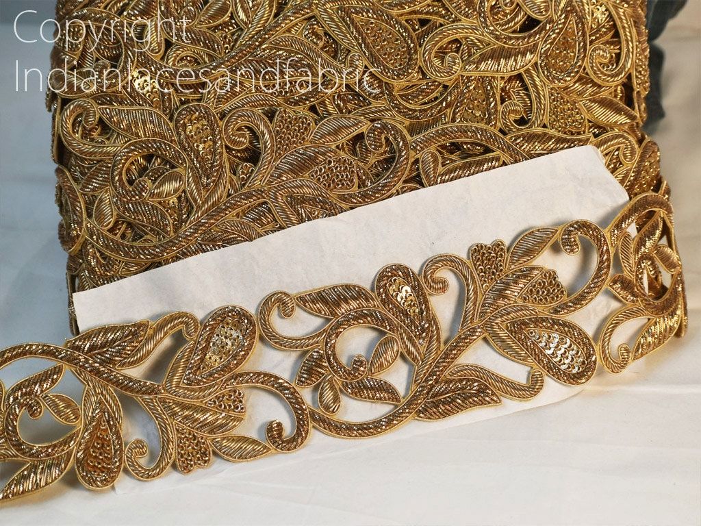 Exclusive Antique Gold Zardozi lace 2.5 Inch trim, a perfect embellishment for a bridal dresses or for festive mood outfit a Zari Work Lace. Our Zardozi Gold Trims will add mystique to your fabric, you can use this lace alone or add it with other laces to create a new unique design for Wedding dress.