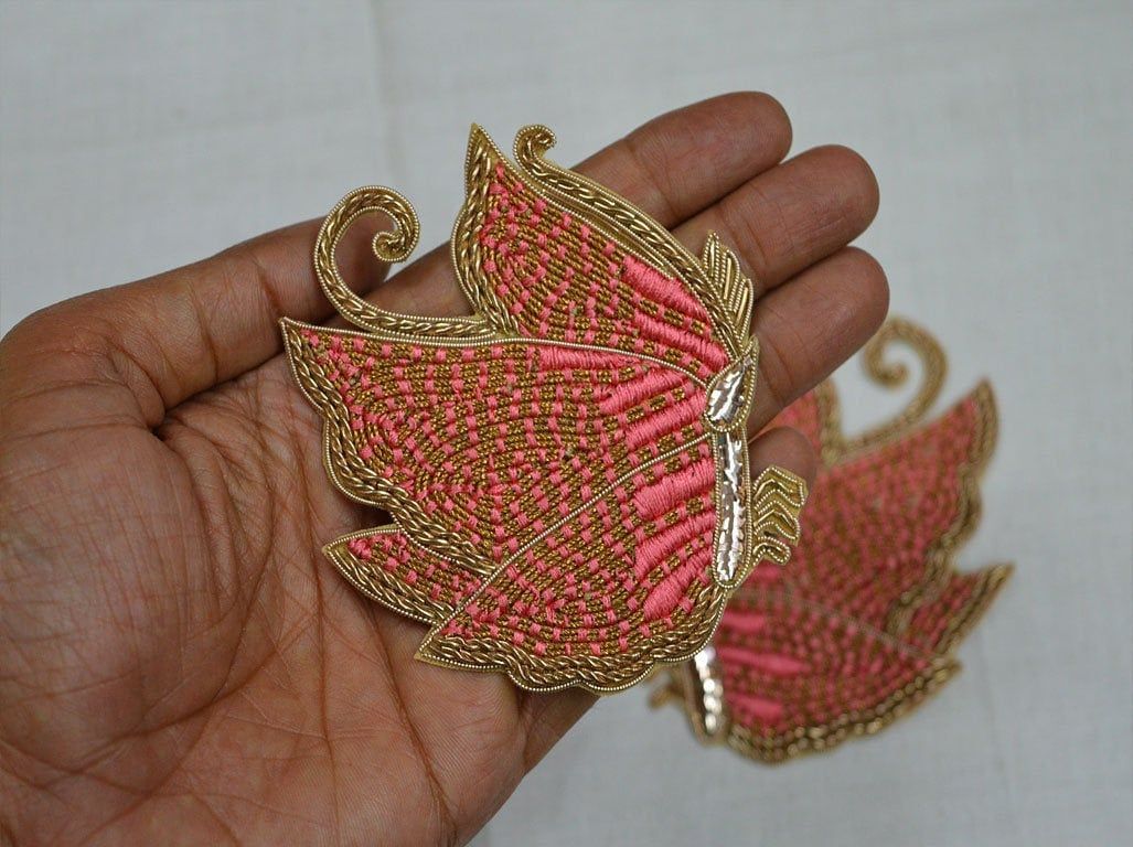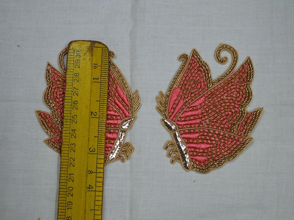 5 Pieces Butterflies Design Appliques are extremely beautiful applique (sew on applique or you can paste it with fabric) in golden finish which gives the exclusive look. Each of them is decorated with Zardozi work, Thread work to make it a perfect piece for embellishing a wedding dress, Wedding Skirt or a sari.