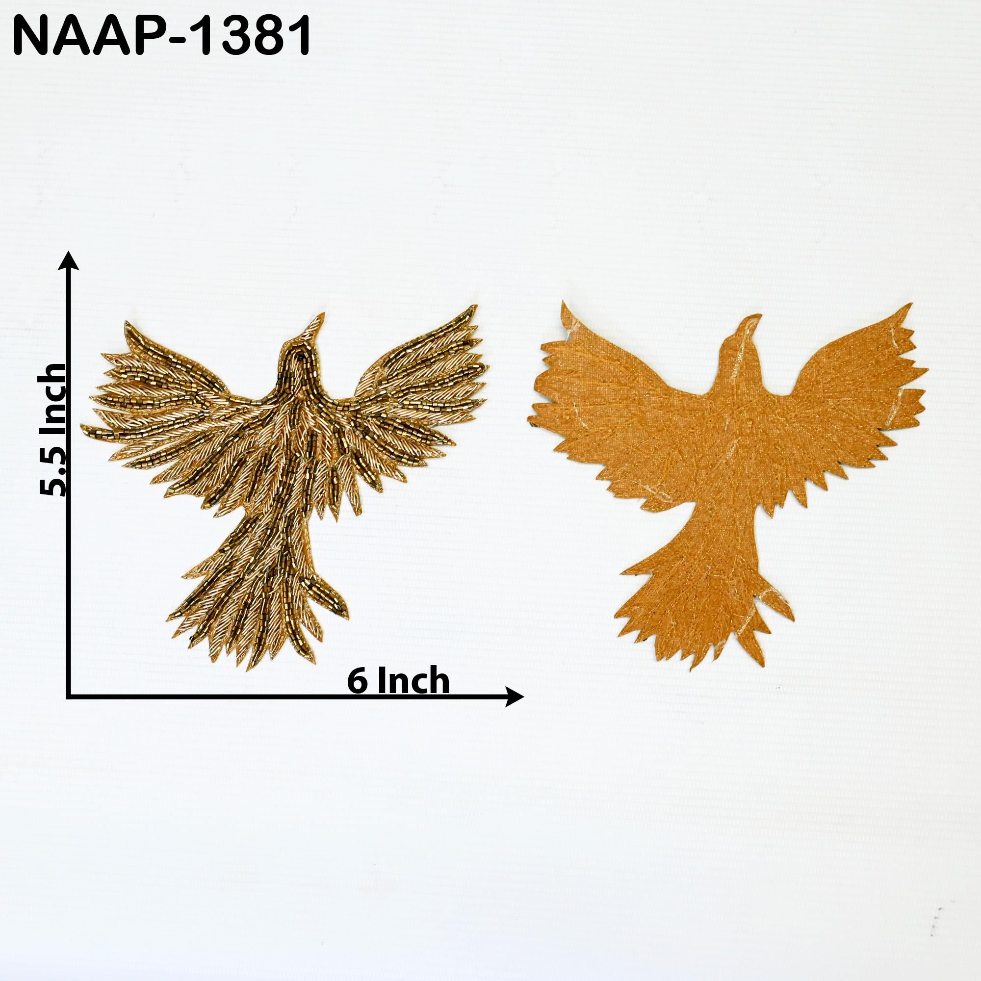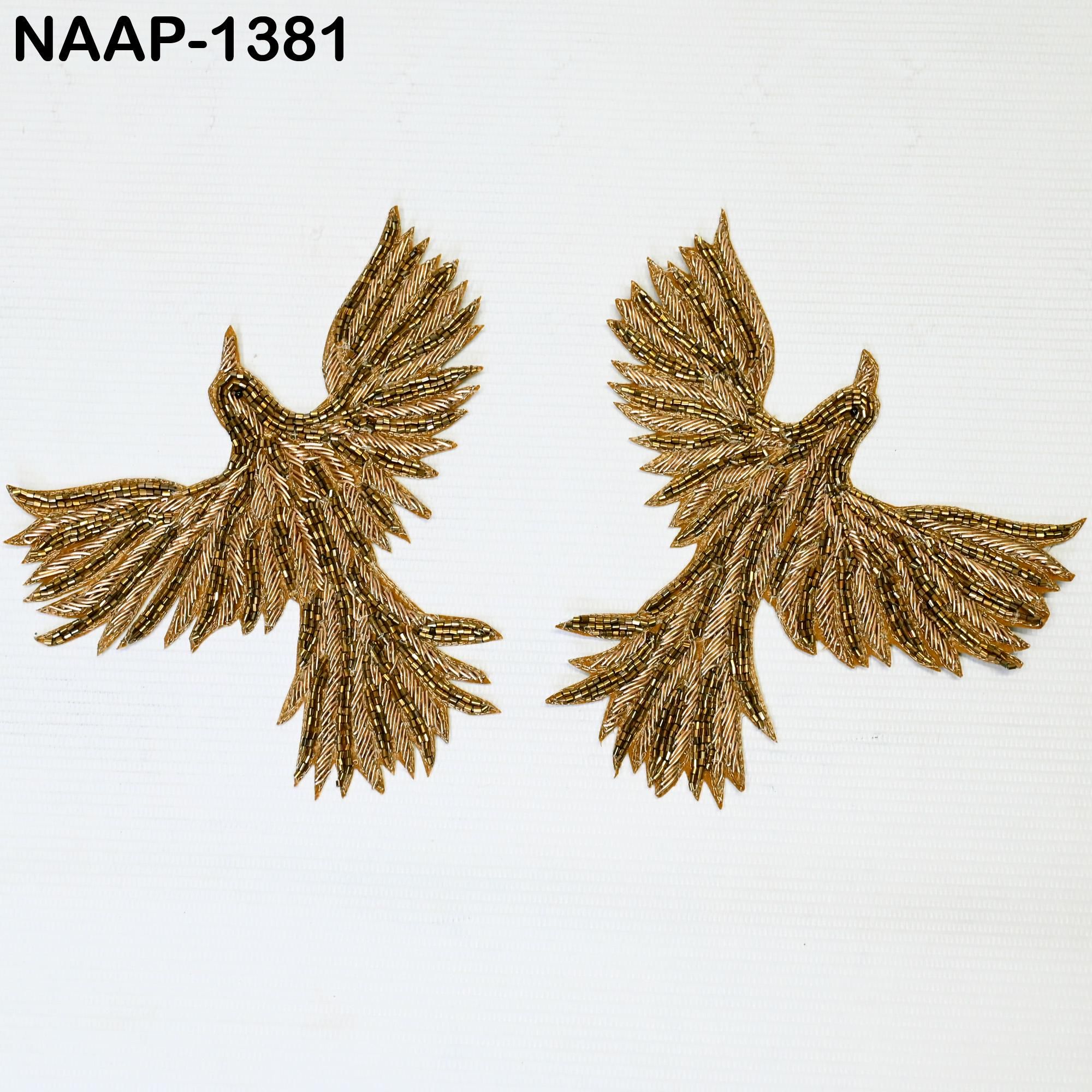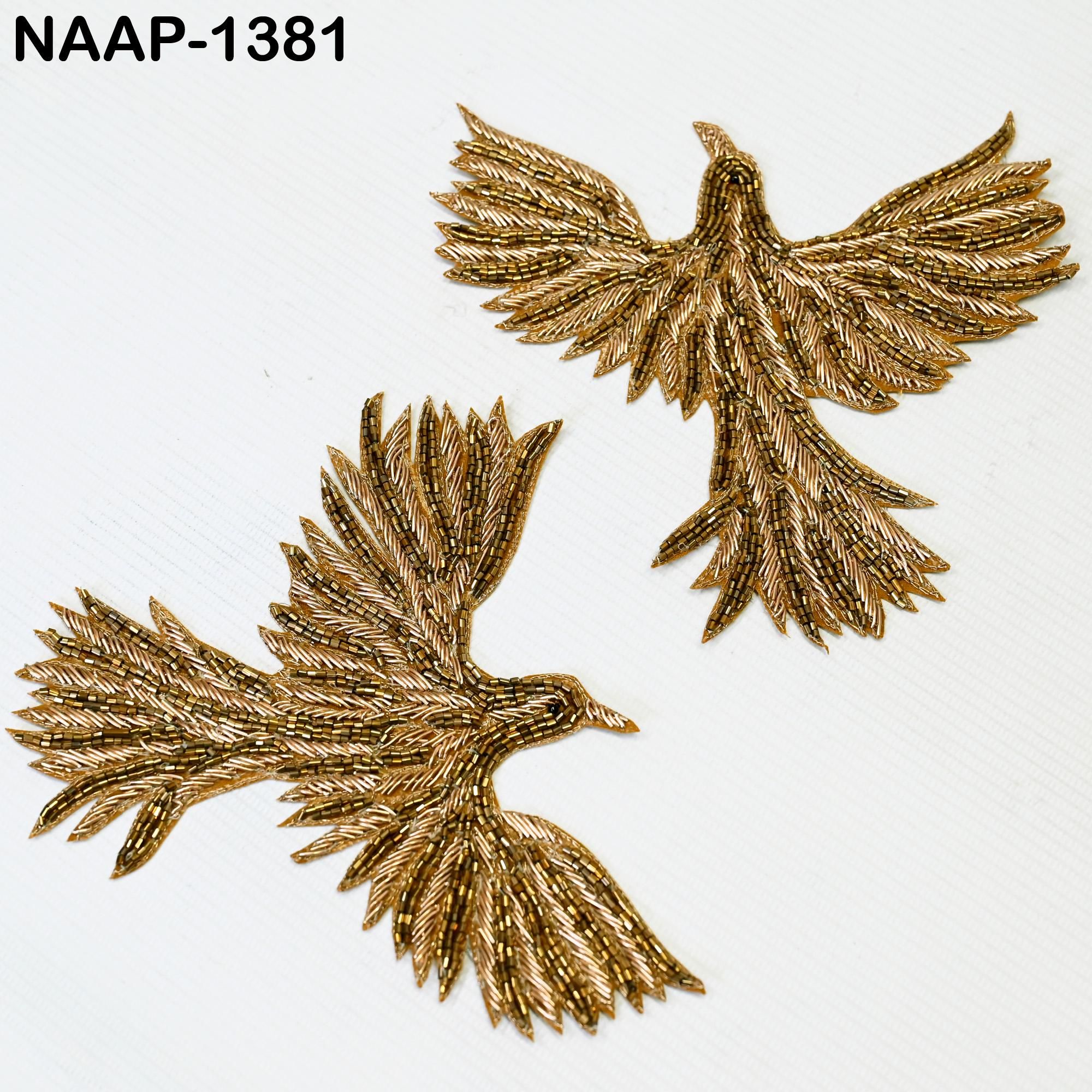 Embroidered Flying Bird Appliqués (2 Pair): Golden Zari Thread, Beaded Indian Patches