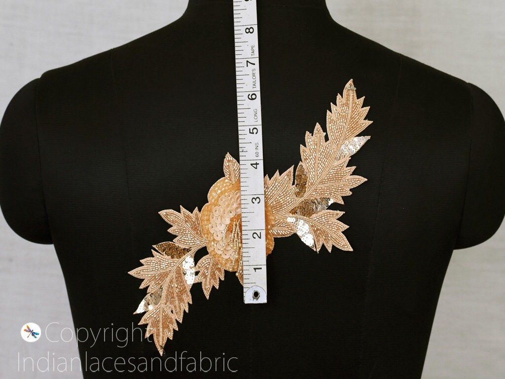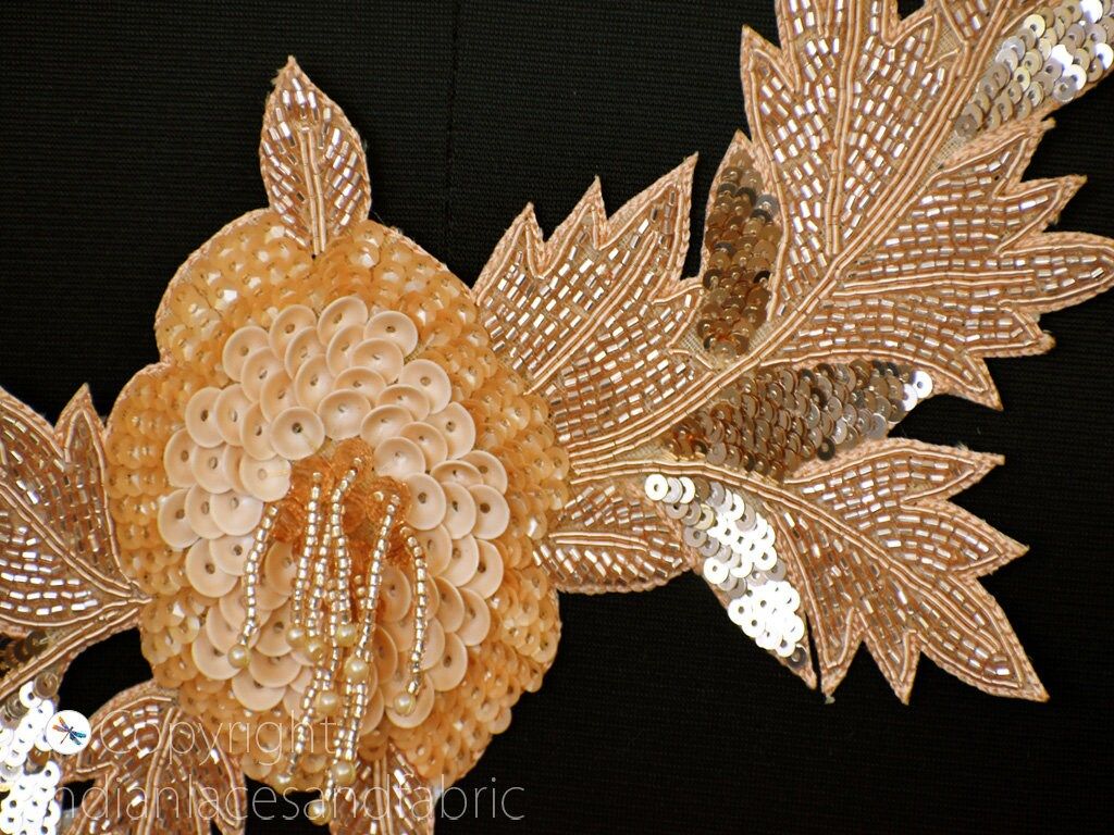 1 Piece Floral Design Appliques in Gold Color is extremely beautiful applique (sew on applique or you can paste it with fabric) in Embroidery which gives the exclusive look. It is decorated with Zari Thread work to make it a perfect piece for embellishing a wedding dress, Wedding Skirt or a sari.