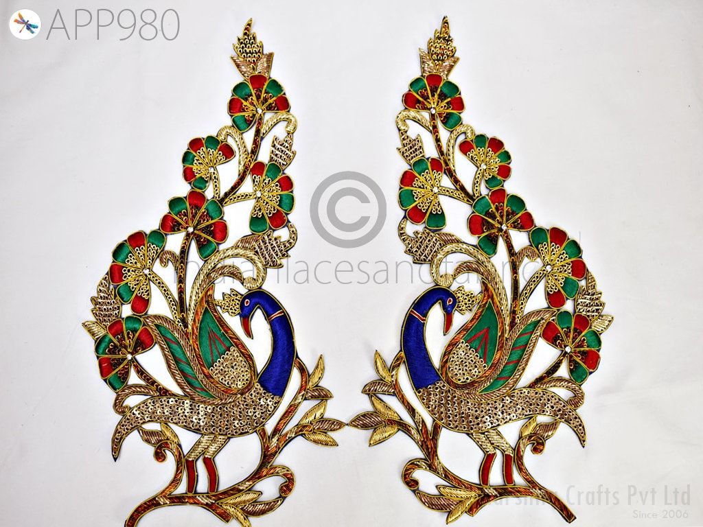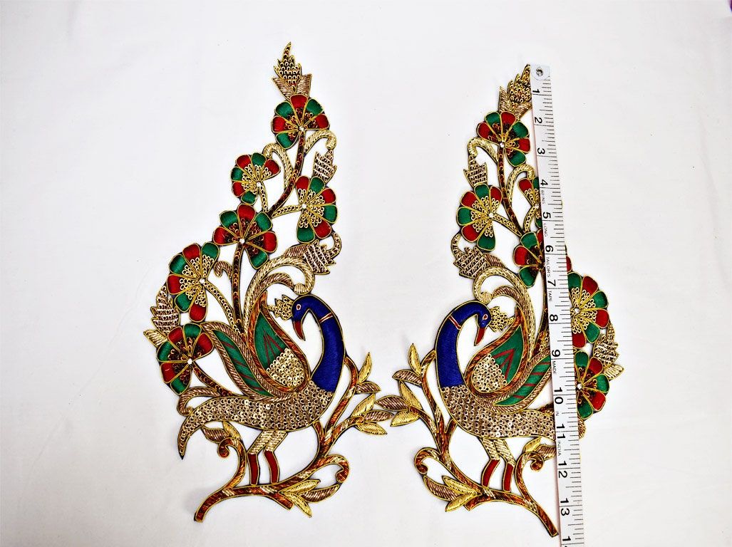 Bring regal elegance to your creations with this handcrafted Gold Peacock Zardozi Appliqué set. Pair of peacock, Face to face Peacock Applique in Red, Green, Blue and Gold Color - Each of them is decorated Sequins with Zardozi work, Thread work to make it a perfect piece for high-end bridal wear, festive costumes, and statement DIY projects.