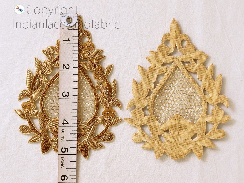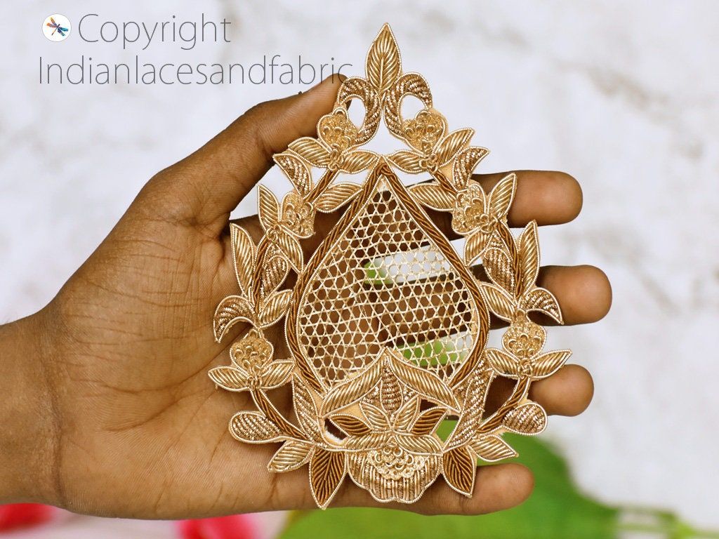 Bring traditional Indian opulence to your garments, crafts, or decor with this 4-piece set of gold Zardozi appliqués, handcrafted by skilled artisans using fine metallic thread, sequins, and beads. Ideal for couture fashion, wedding trousseau, dance costumes, ethnic wear, or DIY embellishment.
