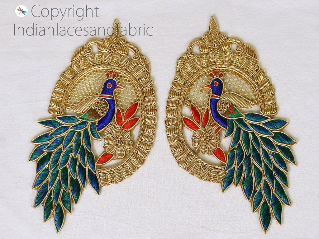 Gold Zardozi Peacock Appliques: Indian Embroidered Patches (Pair)