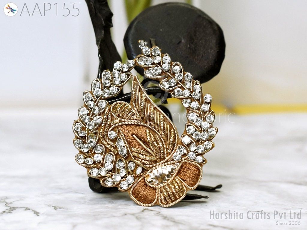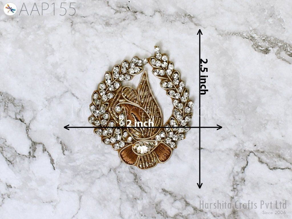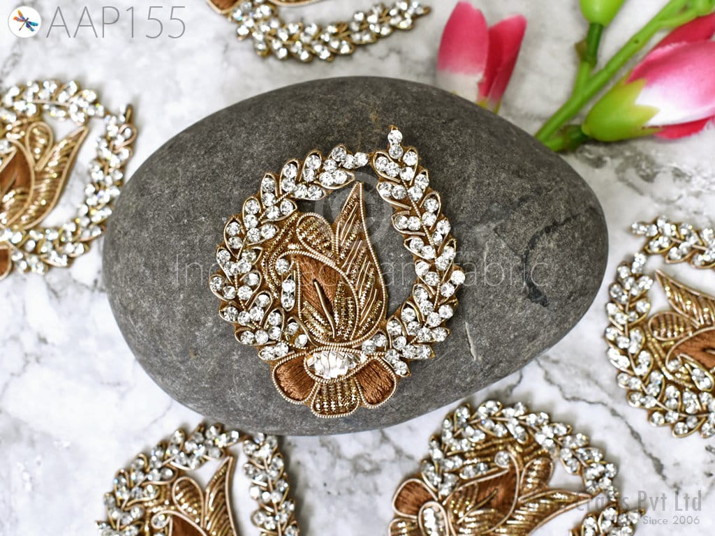 Indian Patches Appliques extremely beautiful sew on applique in Golden finish. Each of them is decorated with layers of rhinestones, Zardozi work, Zari Thread at the center to make it a perfect piece for embellishing a wedding dress, Wedding Skirt or a sari.