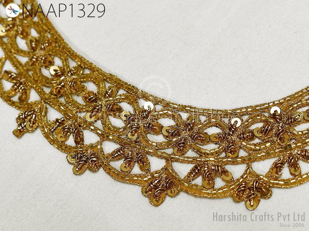 Handmade Gold Sequins Neckline Patches Crafting Zardosi Wedding Dress Neck Patches Decorative Handcrafted Decorative Bridal Costume Applique Handmade Neckline, Bridal Neck, Wholesale Neckline, Sewing Patches, Dresses Neckline.