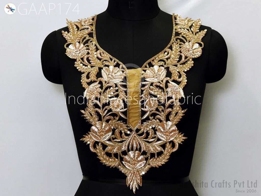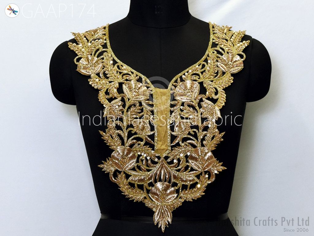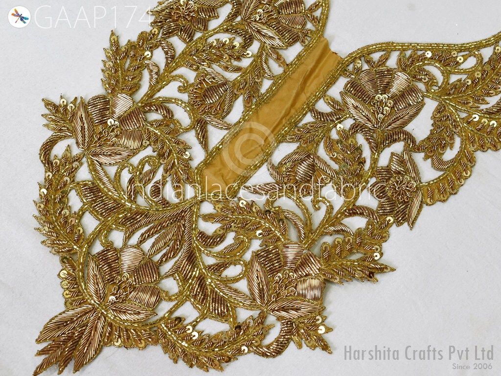 Handmade Zardosi Gold Neck Patch: Indian Embroidered Applique for Dresses