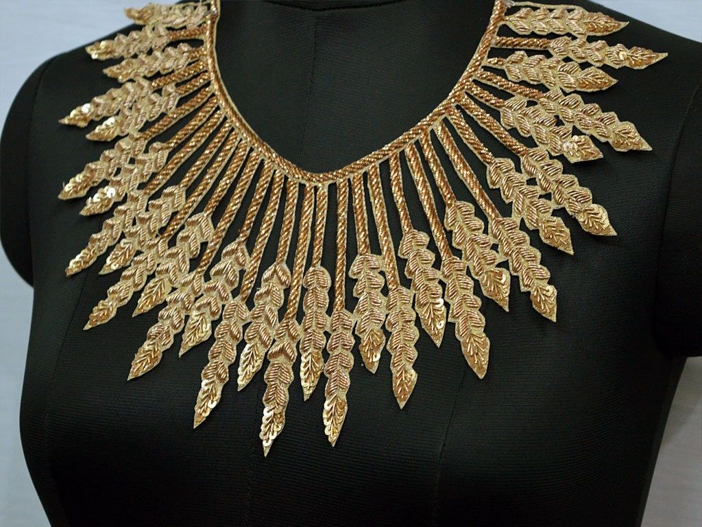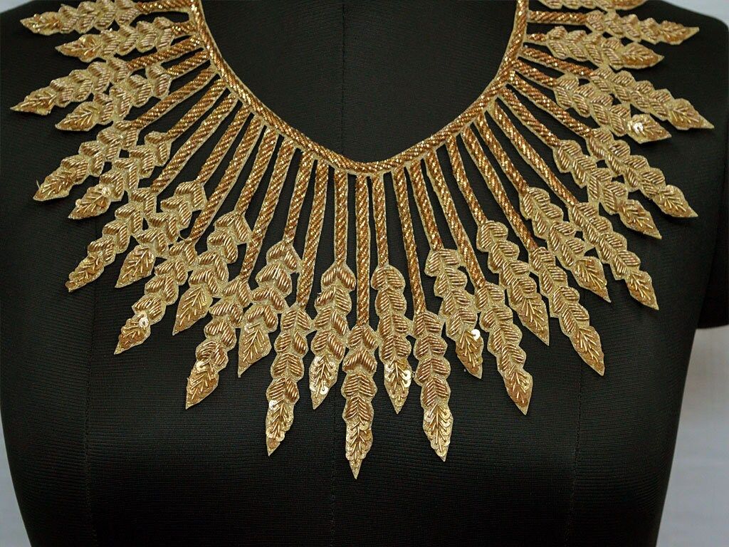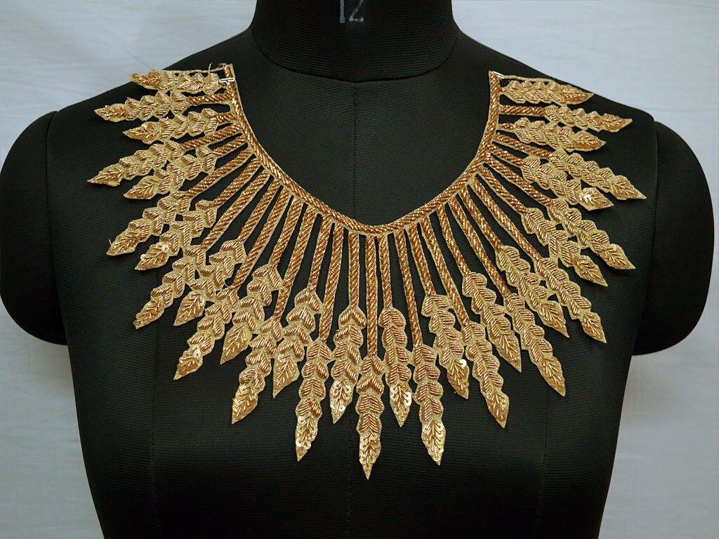 This is exclusive metallic thread embroidered Neckline Patches (Handcrafted Zardosi), has been hand embroidered. Zardozi Neck is an ancient art of sewing gold threads onto the fabric to create extraordinary patterns, giving it a rich look to a bridal dress or classy dress.